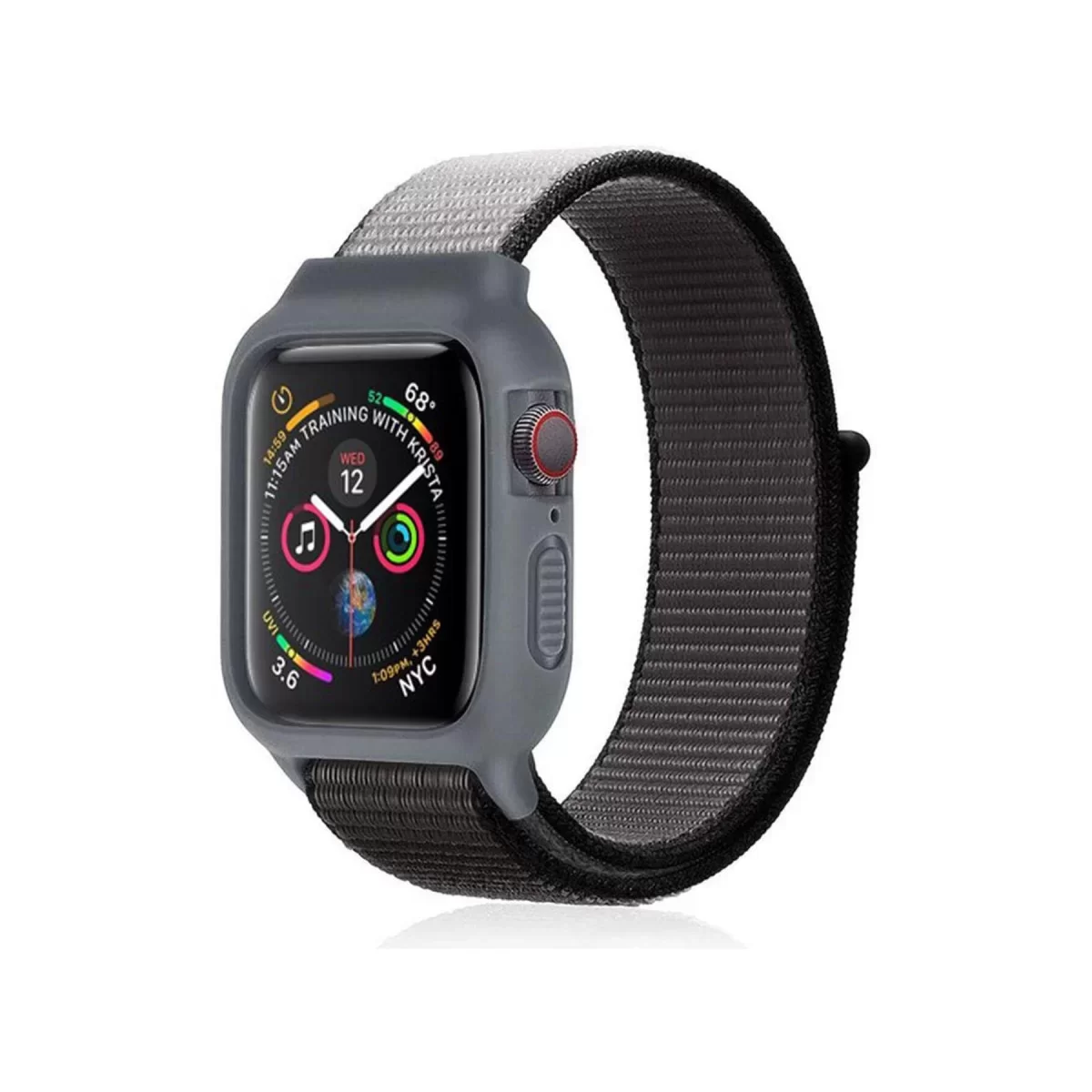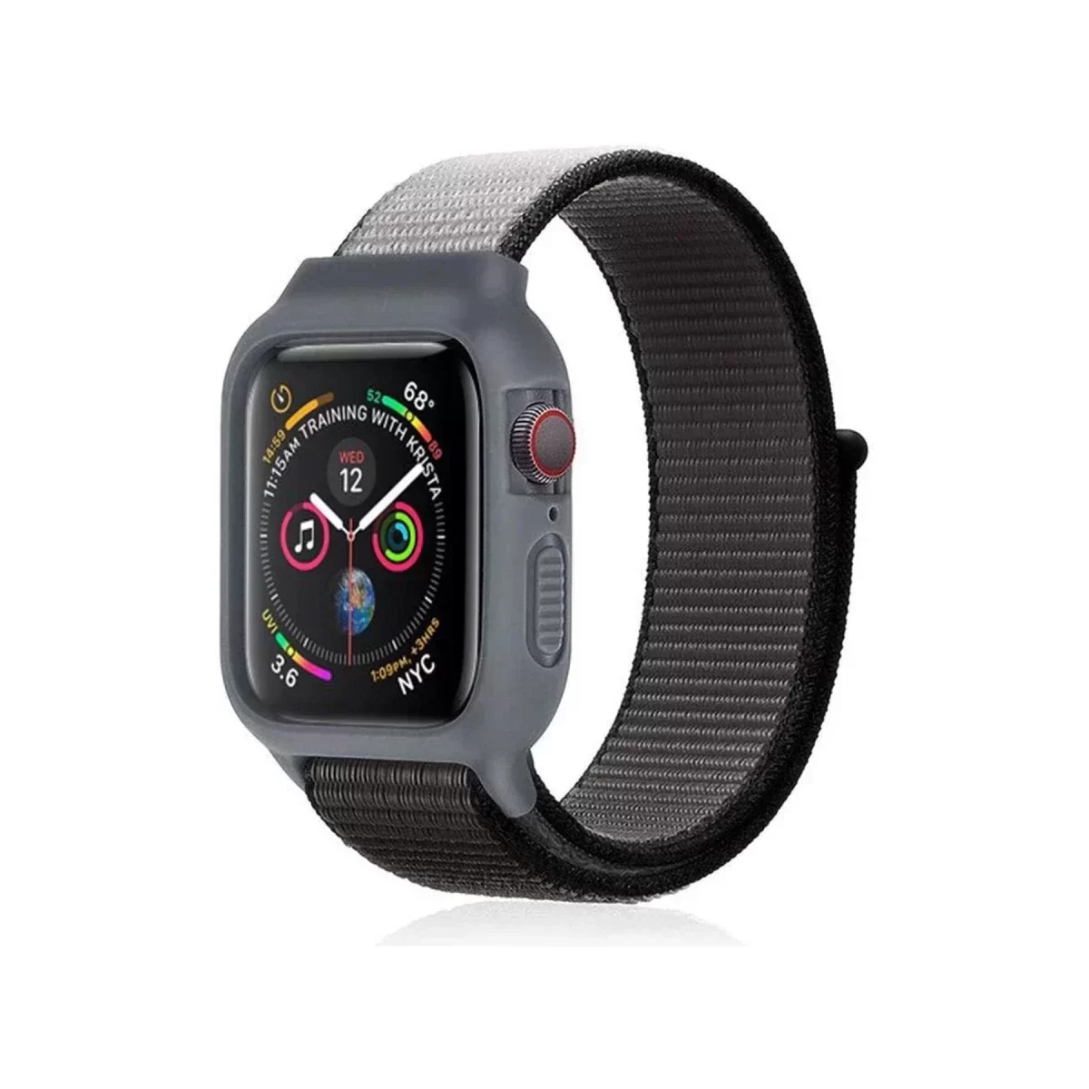 Newface Apple Watch 38mm Hasırlı Cırtcırtlı Kasalı Kordon - Siyah-Gri